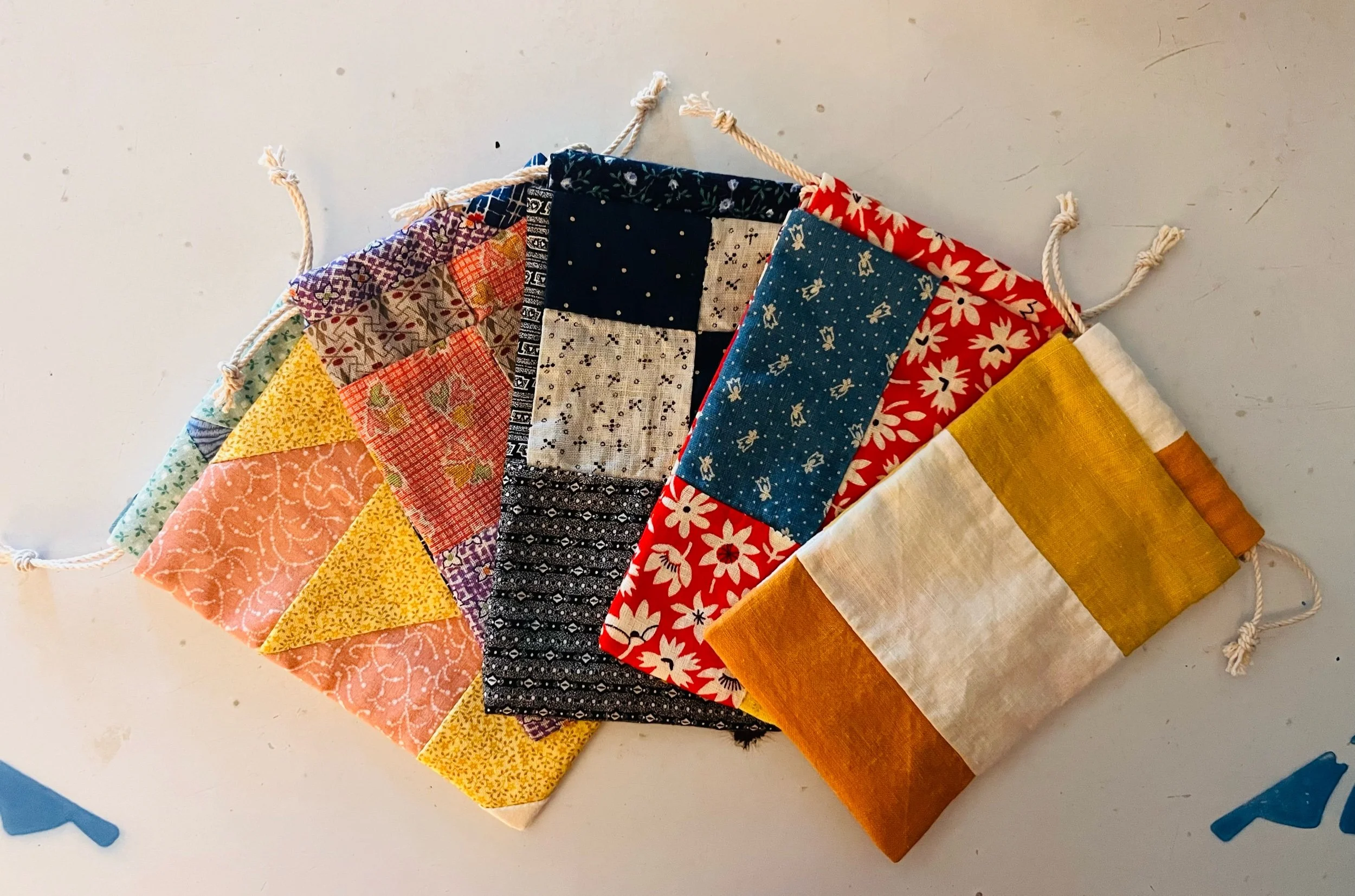 Each come in a hand sewn, one of a kind, draw string pouch by Anemone. Made from beautiful, well-loved quilts.